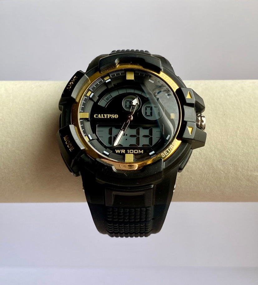 Diseñado para el ritmo activo de cada día, este reloj Calypso deportivo combina funcionalidad digital y estilo analógico en una sola pieza robusta y confiable. Con su diseño resistente, correa de caucho flexible y botones laterales ergonómicos, es perfecto para quienes buscan precisión, durabilidad y carácter.